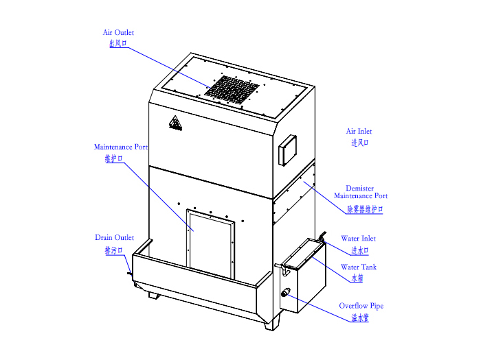 تحت الضغط السلبي الذي تنشئه المروحة ، يدخل الغاز المحمول بالغبار وحدة تصفية المياه ويأتي في اتصال وثيق مع السائل (عادة الماء). من خلال الاصطدام بين قطرات الماء وجسيمات الغبار وآليات جمع أخرى ، يلتقط الجهاز بفعالية الجسيمات السائلة أو الصلبة ذات القطر في3-30 ميكرومنطاق ويزيل أيضا بعض الملوثات الغازية. يتم جذب الماء للأعلى من خلال تدفق الغاز ؛ في تركيبة مع وحدة التشويش والتخلص ، يحدث فصل الغاز والسائل ويعود السائل إلى الخزان ، مما يحققإعادة تدوير المياه بدون مضخة . يحقق النظام كفاءة تنقية ≥90٪ للجسيمات الأكبر من 10 ميكروم.